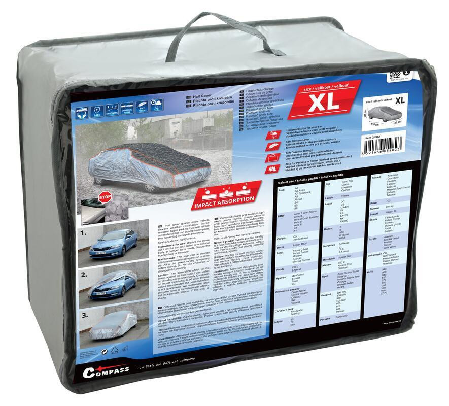Plachta je velice robustní a spolehlivě chrání auto i před těžkými padajícími předměty jako jsou kroupy nebo větve během vychřice. Díky pružným lemům a třem páskám spolehlivě drží na libovolném typu karoserie. Přestože je povrch voděodolný, plachta je prodyšná a karoserie pod ní nekoroduje.