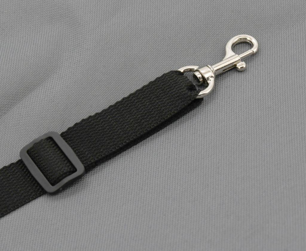 Potah je na boku opatřen zipy pro snadný nástupu a výstup psa. Součástí potahu je také popruh s karabinou pro uchycení obojku.